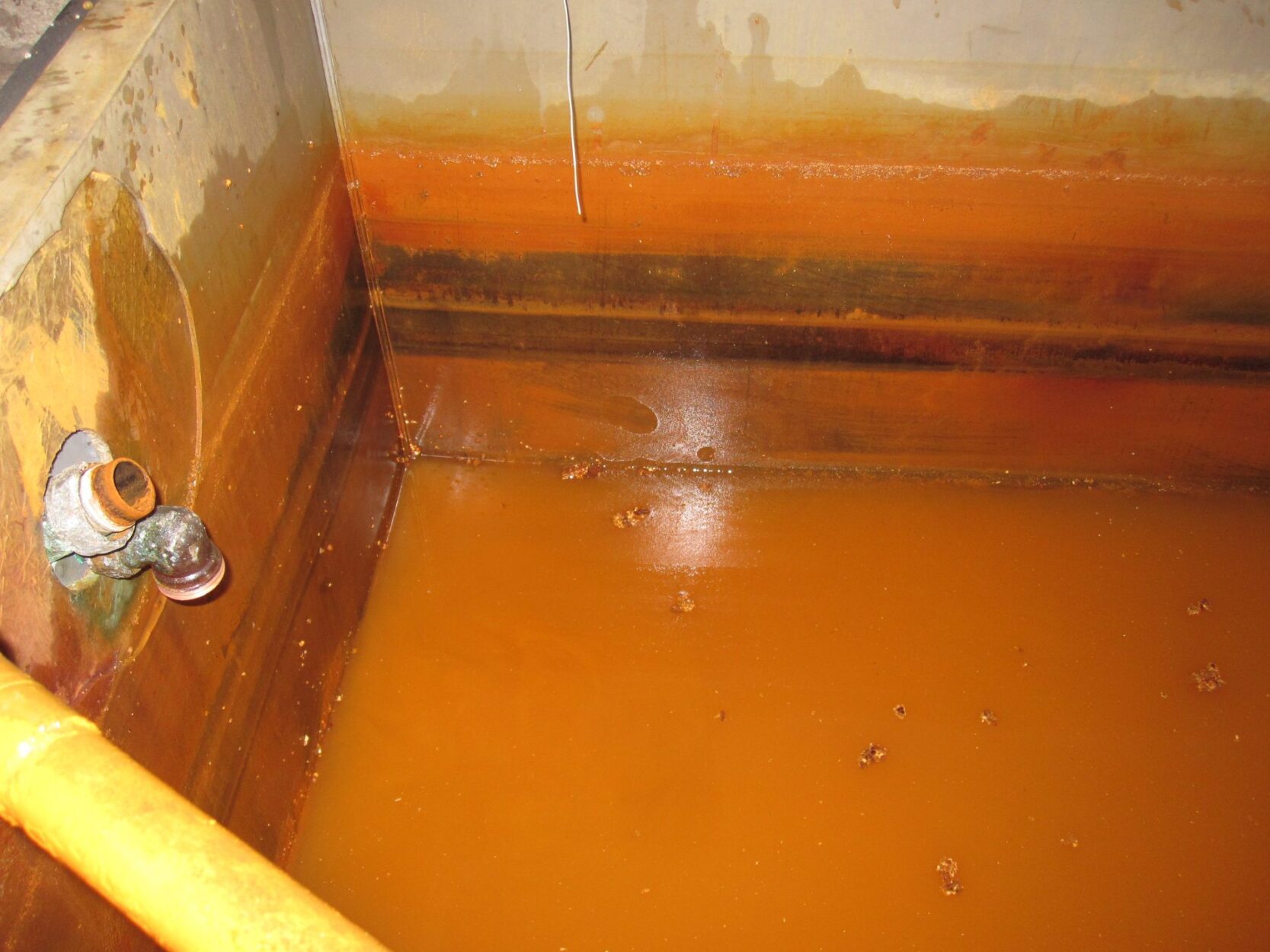 This it does and the oxygen starts to react with the iron. The majority of the iron changes from the Ferrous (dissolved, Fe 2+) state to the Ferric (precipitated, Fe 3+) state and starts to deposit in the tank.